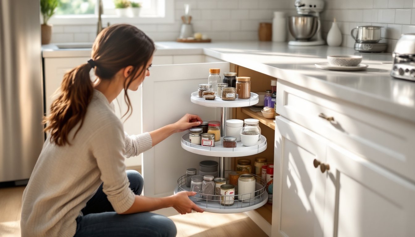 For high-use cabinets storing cookware or appliances: Invest in pull-out shelving. The upfront cost is justified by daily convenience and durability. Lazy Susans work but can become cluttered quickly with bulky items.